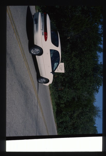 a white car is running on the road a board is placed in front of it.