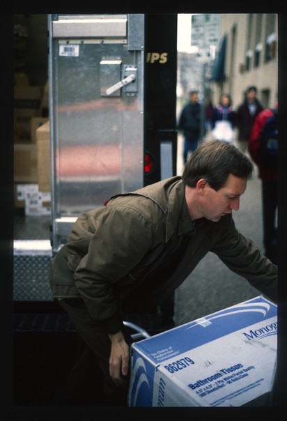 unloading, worker, box, white, blue, bathroom, tissue, toilet paper, truck, brown, uniform,