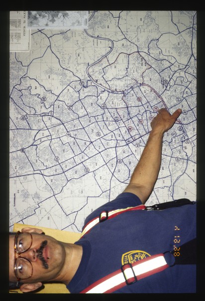the man isstanding and showing the map and wearing blue shirt