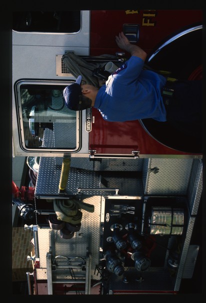A vehicle is seen with so many racks, hoses and pipes and seemed to be a fire engine vehicle.