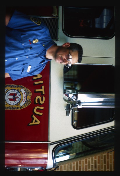 Fireman with short cut hair standing in front of a shiny fire engine.