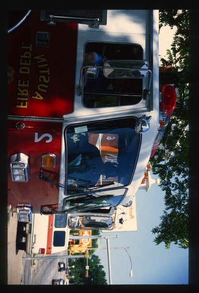 It is a sideways picture of the Austin Fire Department's red trucks on a clear, sunny day.