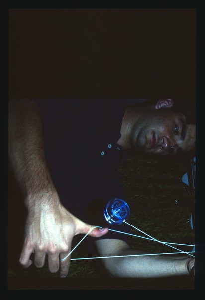 A man in a blue t-shirt with three white buttons playing with a blue yo-yo on a white string.