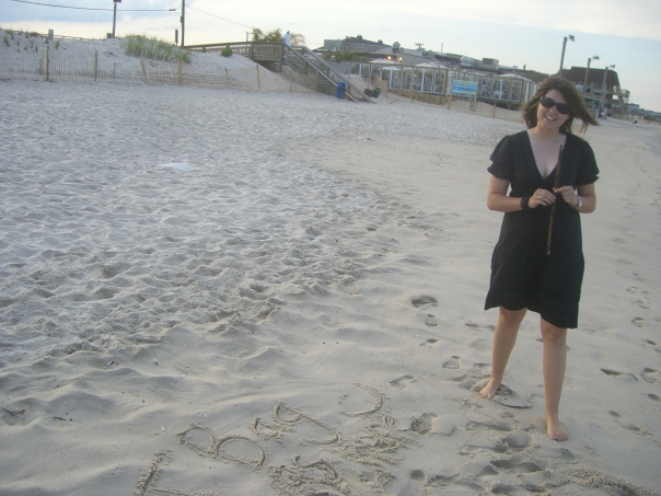 Lady in a black dress barefoot on a sandy beach with buildings in the background