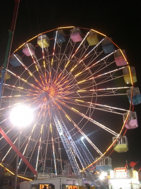 a night scene of a ferris wheel, all light up we can see soft yellows, and pinks.