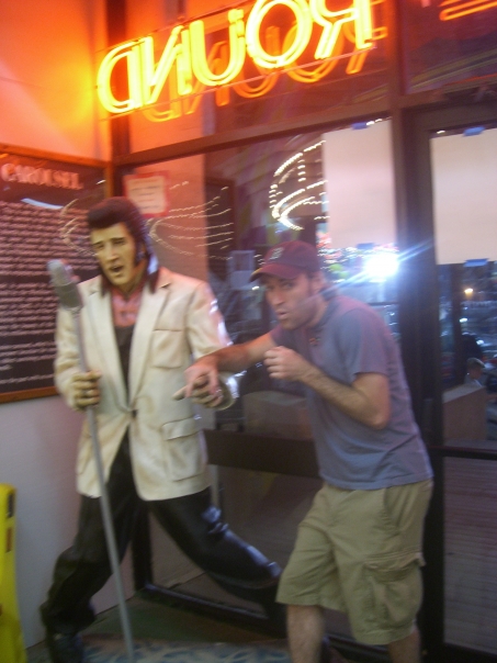 The man wearing a blue shirt and shorts is posing with an Elvis statue.