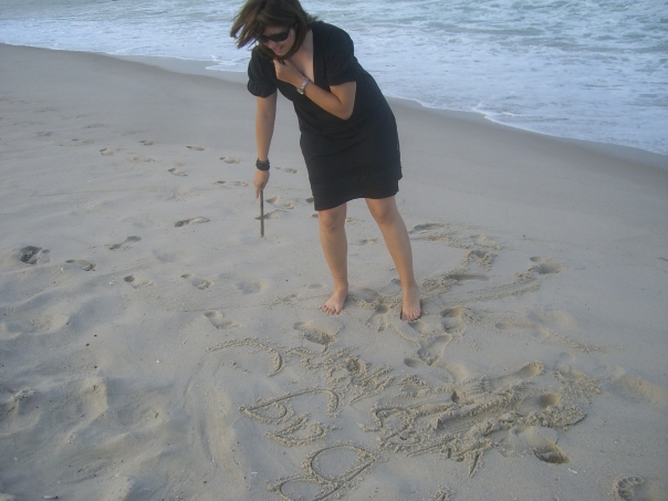 This is a woman writing messages in the sand with a stick near the ocean.