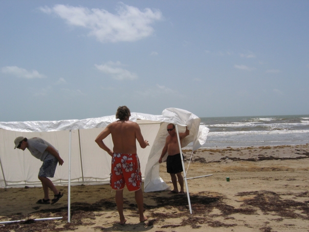 three guys standing on the beach with a white canopy