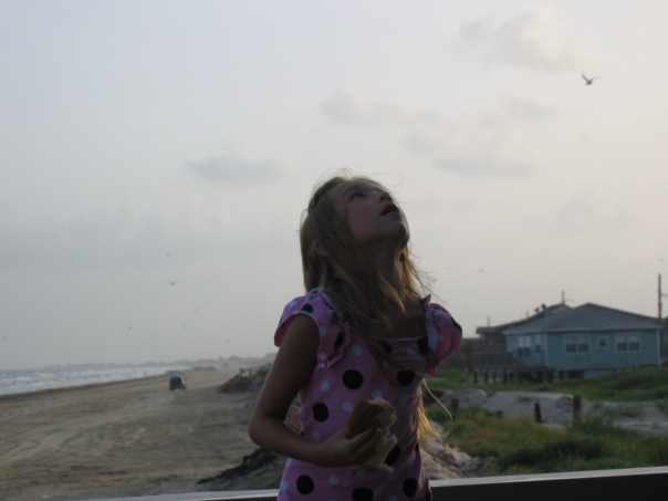 A young girl standing on a beach looks up towards the sky with a curious expression on her face while holding a half-eaten sandwich.