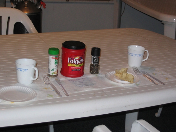 A white kitchen table with 2 coffee cups, a can of Folgers, two paper plates, 2 sets of silverware and 2 spice containers.