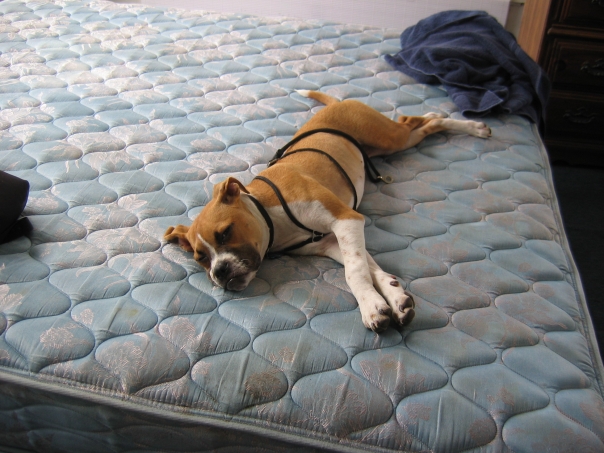 A tired looking dog wearing a harness lounging on a mattress. There is also a towel on the bed.