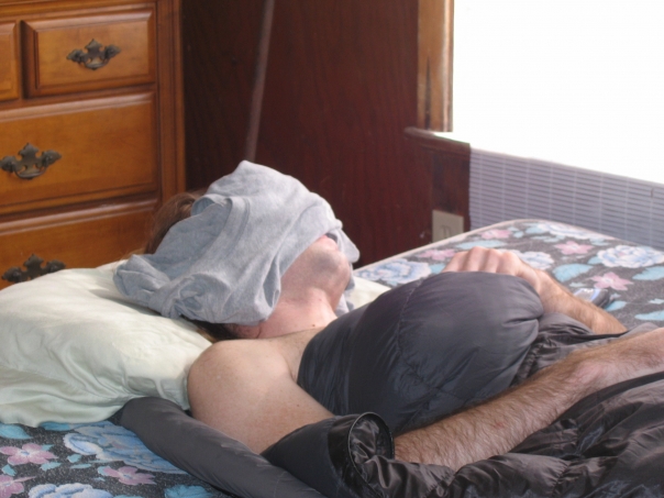 A man sleeping on a bed with a t-shirt covering his face, and a dresser in the background.