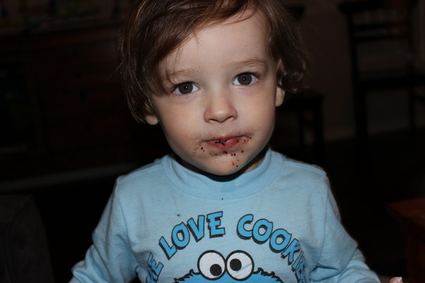 A handsome toddler boy who has chocolate crumbs around his mouth is wearing a blue long sleeved cookie monster shirt.