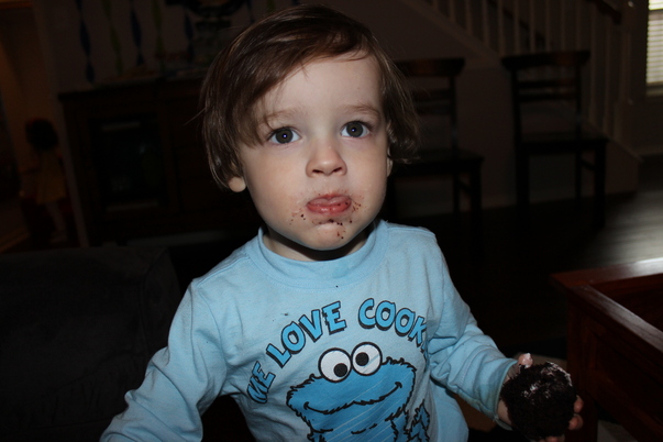 A little white boy in a blue cookie monster pajama shirt eating a chocolate cupcake.