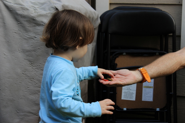 A child taking candy out of a person's hand.