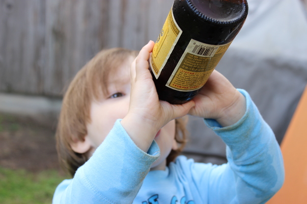 It shows a male child drinking out of a dark bottle with both hands on the bottle. The setting is outside near a building.