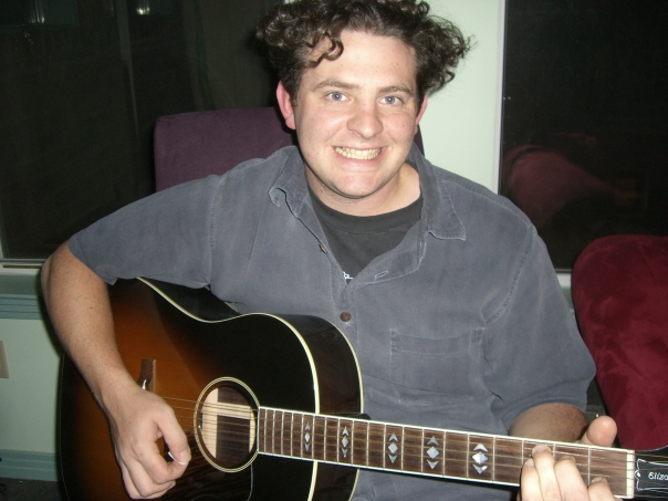 Smiling, fun looking young man playing a wooden acoustic guitar.