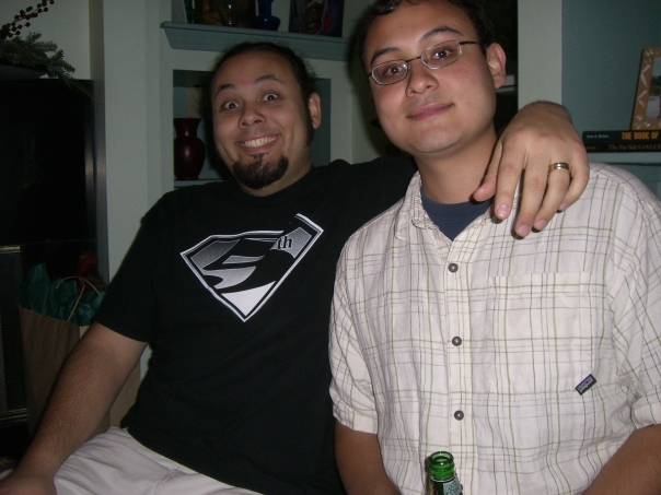 Two men with short dark hair, one is wearing a black t shirt with a silver spider-man like symbol, wearing wedding ring, and has a goatee, the other man appears to maybe have touch of eastern Indian ancestry and is holding a green beer bottle and wearing a light colored, button down shirt.
