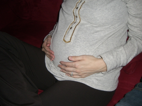 A pregnant woman uses both hands to hold her belly swollen with child.