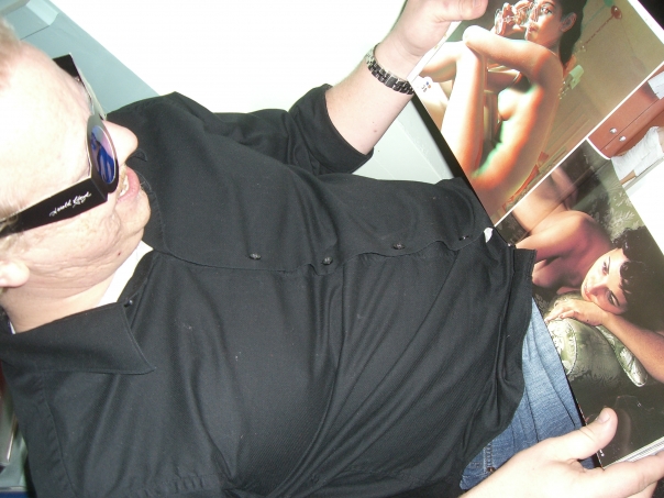 An older man wearing a black button-down shirt, jeans, and sunglasses looking at somewhat tasteful naked pictures of women.