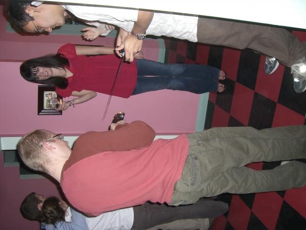Black and red checkboard floor, many people gathered around, pink walls, young woman in red shirt with long dark hair, blue jeans, and sandals, two males discovering a remote control device, male with arm around female in background.
