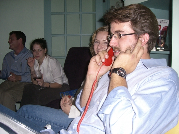 Man with a beard and glasses using a red phone handset while people watch him. A man laughs in the background.