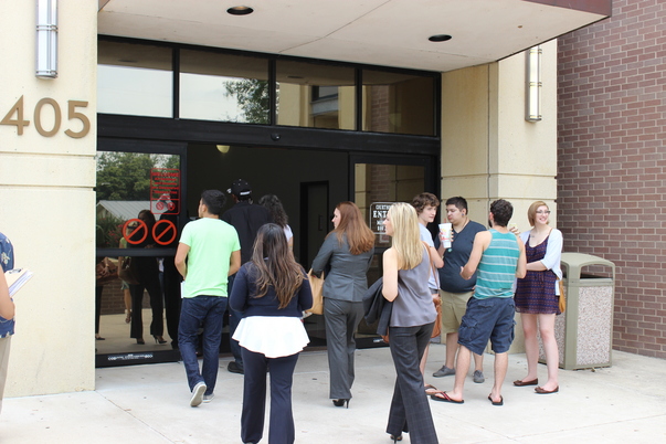 This is a picture of a group of people half in business attire and the other half in regular clothes walking into a building.