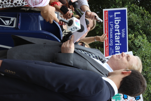 A member of the Texas Libertarian party address reporters while his supporters look on.