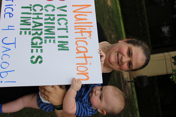 This is a woman holding a baby and a sign that says "Nullification Victim Crime Charges Time Justice 4 Jacob!"