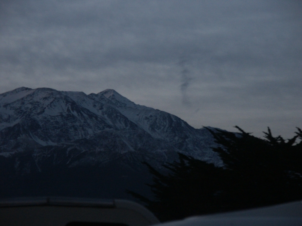 A pretty dark photo of a snow covered mountain (possibly a ski area) in the distance.