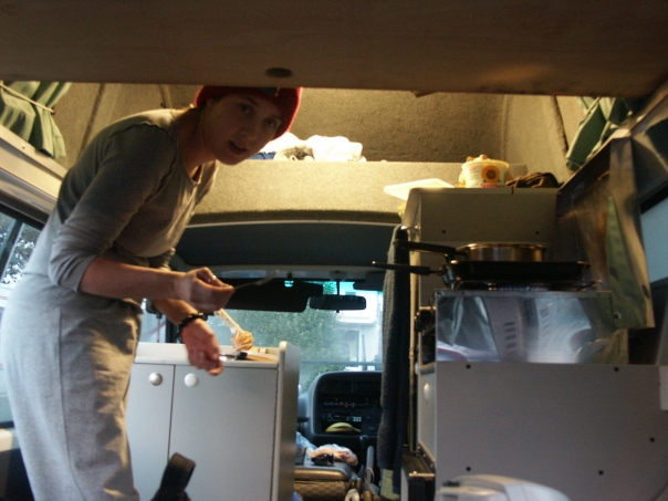 Person holding a fork in thier hand with a stove in front of them inside a motorhome