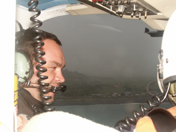this is a pilot flying over a body of water wearing ear phones.