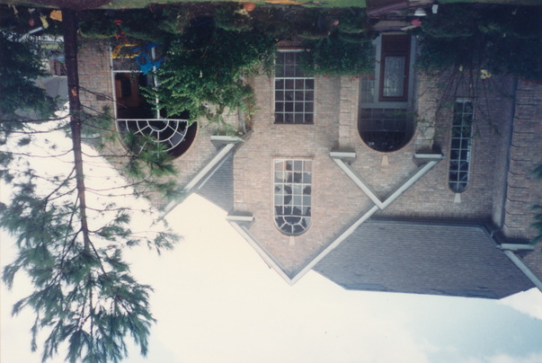 This upside down picture is of a very expensive tan colored brick home with curved and paned windows.