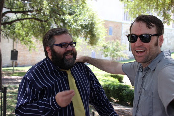 Two male friends wearing dark sunglasses are having a happy conversation in a shady spot of a park.