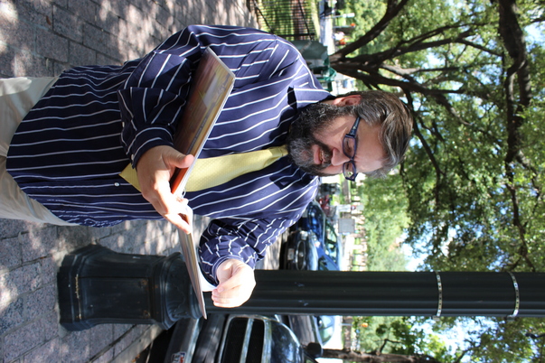 A man in a striped blue shirt and yellow tie is reading from a book on the cobbled sidewalk.