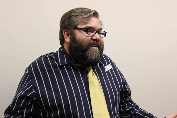 A large bearded poses in a blue striped shirt and yellow tie.