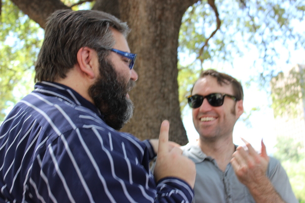 Two men enjoying an enlightening conversation outside on a beautiful day.