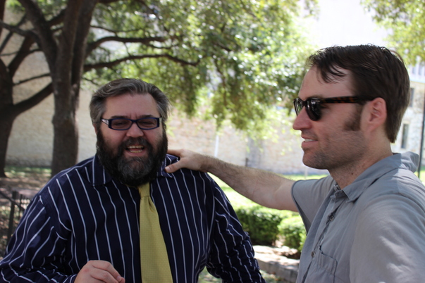 A man with a beard standing next to a man with dark sun glasses.