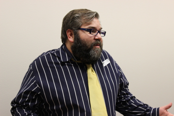 The bearded man in the blue striped shirt looks like he has no idea what the meeting is about.