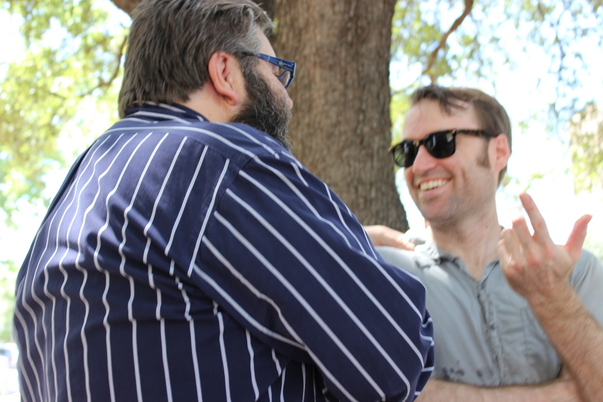 Two men are standing near a tree and are having a lighthearted conversation.
