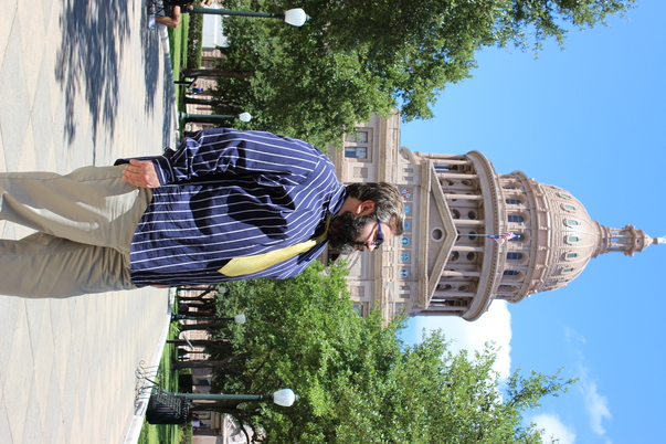 Man in a striped blue shirt and a yellow tie stands in front of an ornate government building.