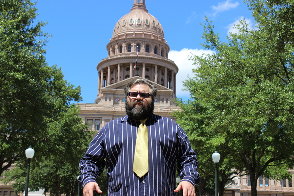 A large angry looking man stands in front of a state capital building.