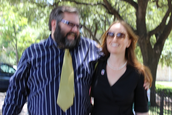He has his arm casually around the lady;s shoulder, like a casual photograph of workers together.