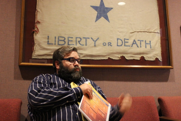 He looks like he is going to hold up a sign and speak about it.