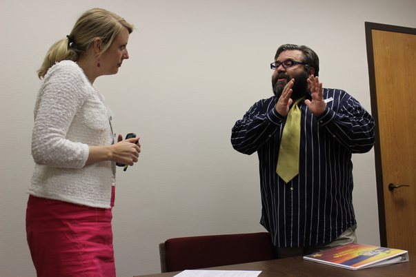 ONE GUY IS EXPLAINING ABOUT SOME THING VERY SERIOUSLY TO A LADY
