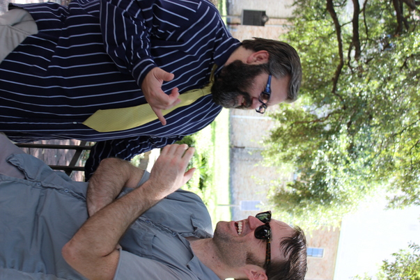 A MAN WEARING A BLACK AND WHITE PIN STRIPE SUIT WITH A YELLOW TIE AND A GUY WEARING A GREY BUTTON UP SHIRT TALKING TO EACH OTHER.