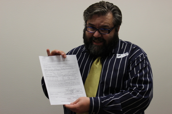 man in black shirt holding a sheet of paper and telling something
