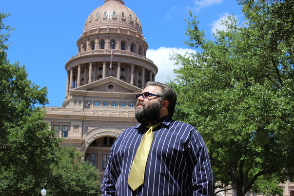 A chubby mail with a scruffy beard and hipster glasses stands in front of what looks like a capital building.