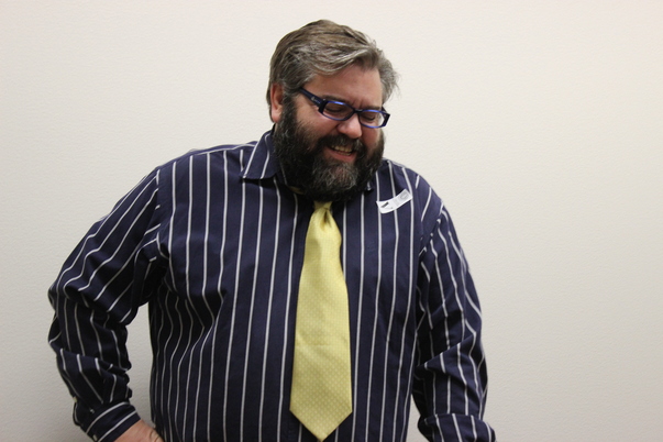 This is a picture of a man standing there with a striped blue shirt and a yellow tie.