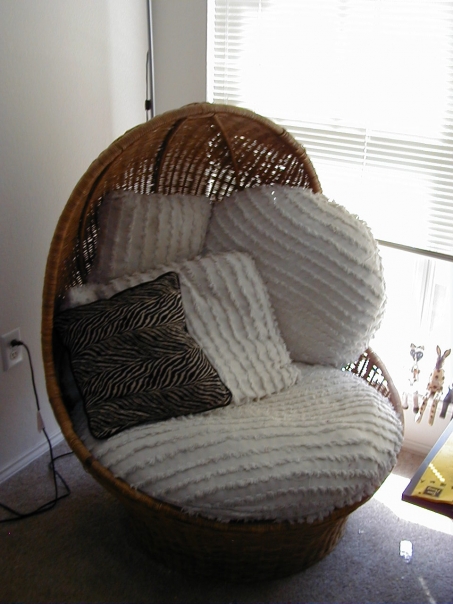 A rattan chair filled with white, nubby cushions and a zebra patterned pillow sat in the corner of the room by the window.